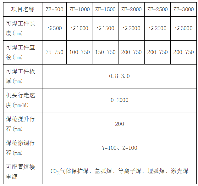 應(yīng)用范圍:技術(shù)參數(shù)項(xiàng)目名稱ZF-500ZF-1000ZF-1500ZF-2000ZF-2500ZF-3000可焊工件長度(mm)≤500≤1000≤1500≤2000≤2500≤3000可焊工件直徑(mm)75-750100-750150-750200-750200-750200-750可焊工件板厚(mm)0.8-3.0機(jī)頭行走速度(mm/M)0-2000焊槍提升行程(mm)200焊槍微調(diào)行程(mm)Y=1