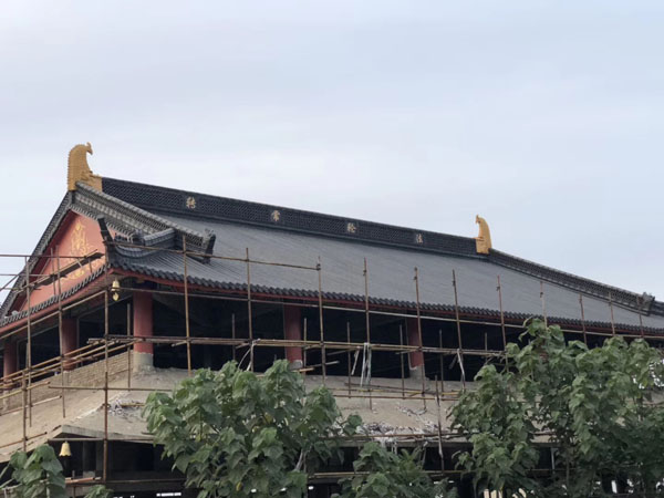 古建寺院-筒瓦鋪蓋 正脊兩端用的金色的魚吻,重檐歇山式寺院,仿古瓦規格:260*130 顏色:青黑無光