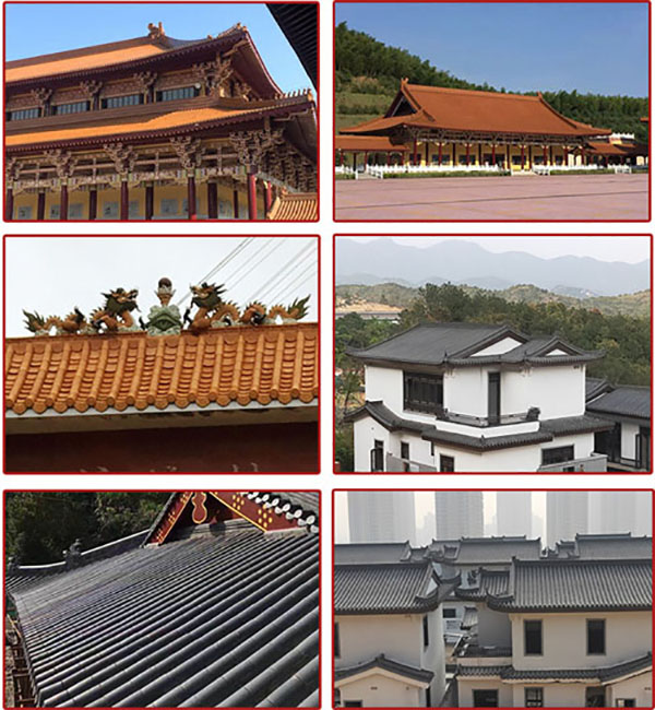 仿古瓦適用:中式仿古建筑、公園、別墅、園林、牌坊、廟宇、寶塔、圍墻、徽派建筑等。